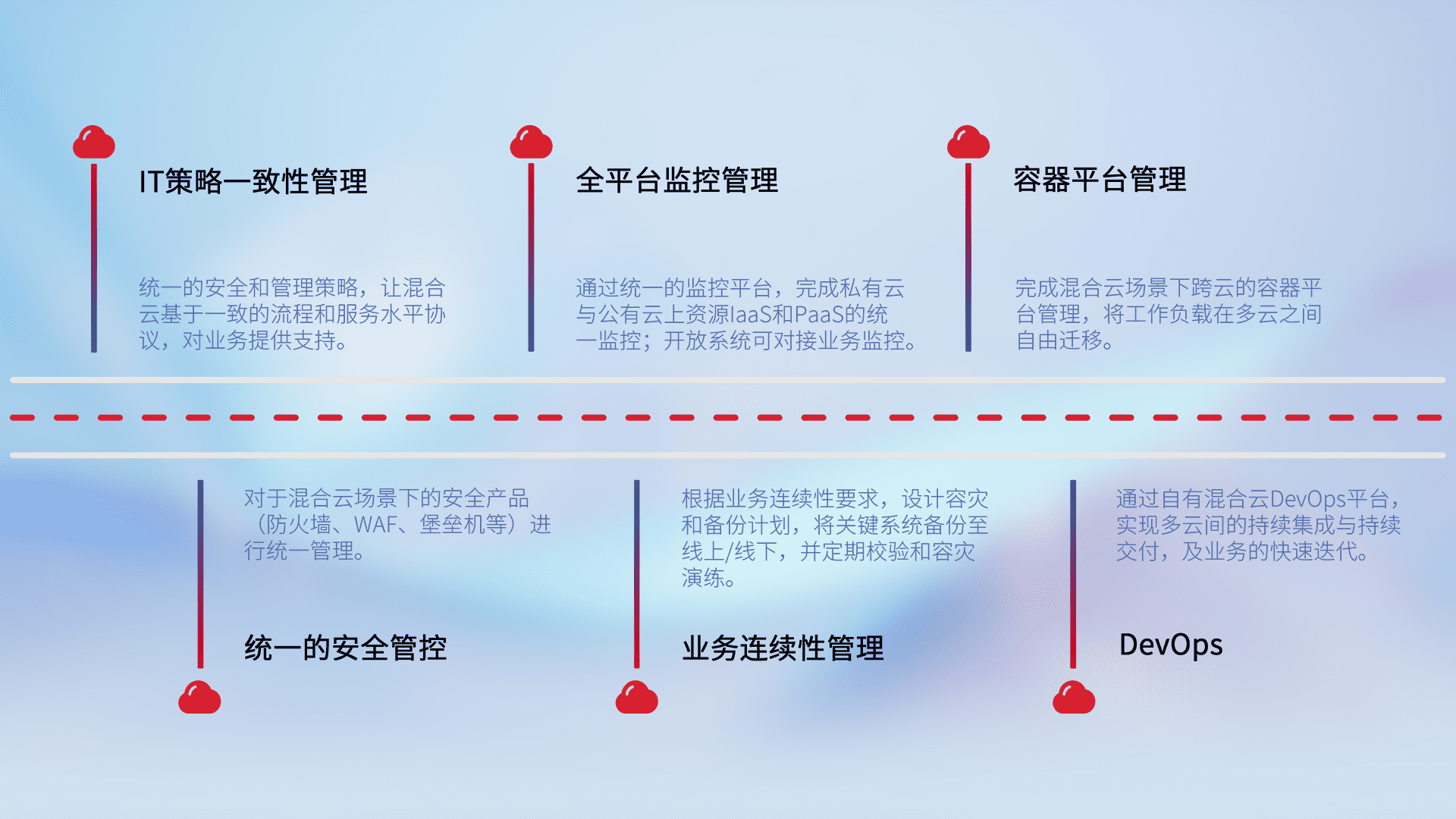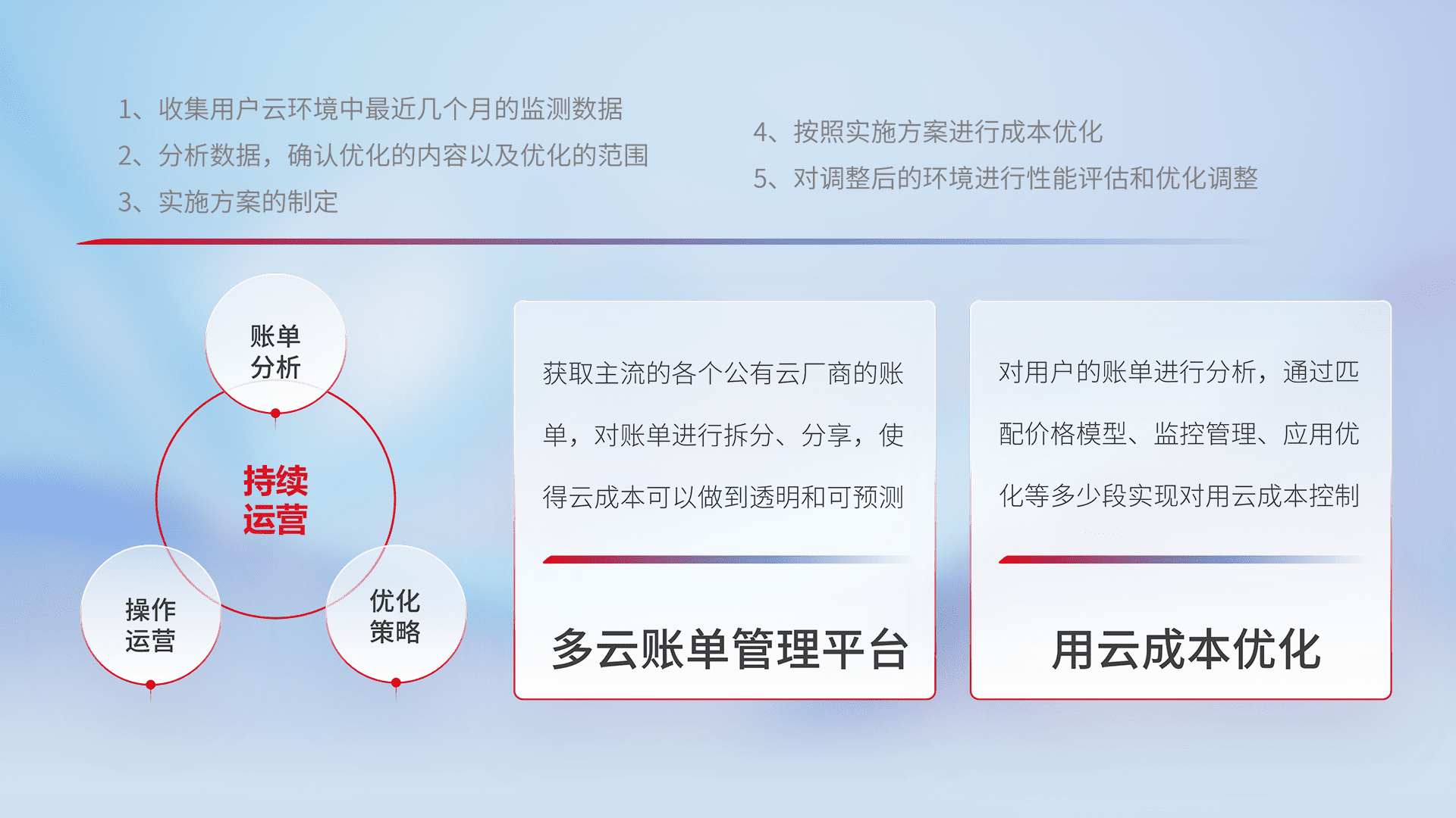 通过多云纳管,,,,以统一的资源数据模型把客户的云资源进行抽象和封装,,,,进而实现对多云资源的统一操作,,,,保障云资源管理的可靠性、、、、稳定性与可用性。。量身定制化运维内容,,,,配置、、、、开发运维、、、补丁管理、、、备份、、、监控、、认证和访问管理、、、审计和日常巡检等,,,保障在用云过程中的可靠度,,,,稳定度以及高可用率。。